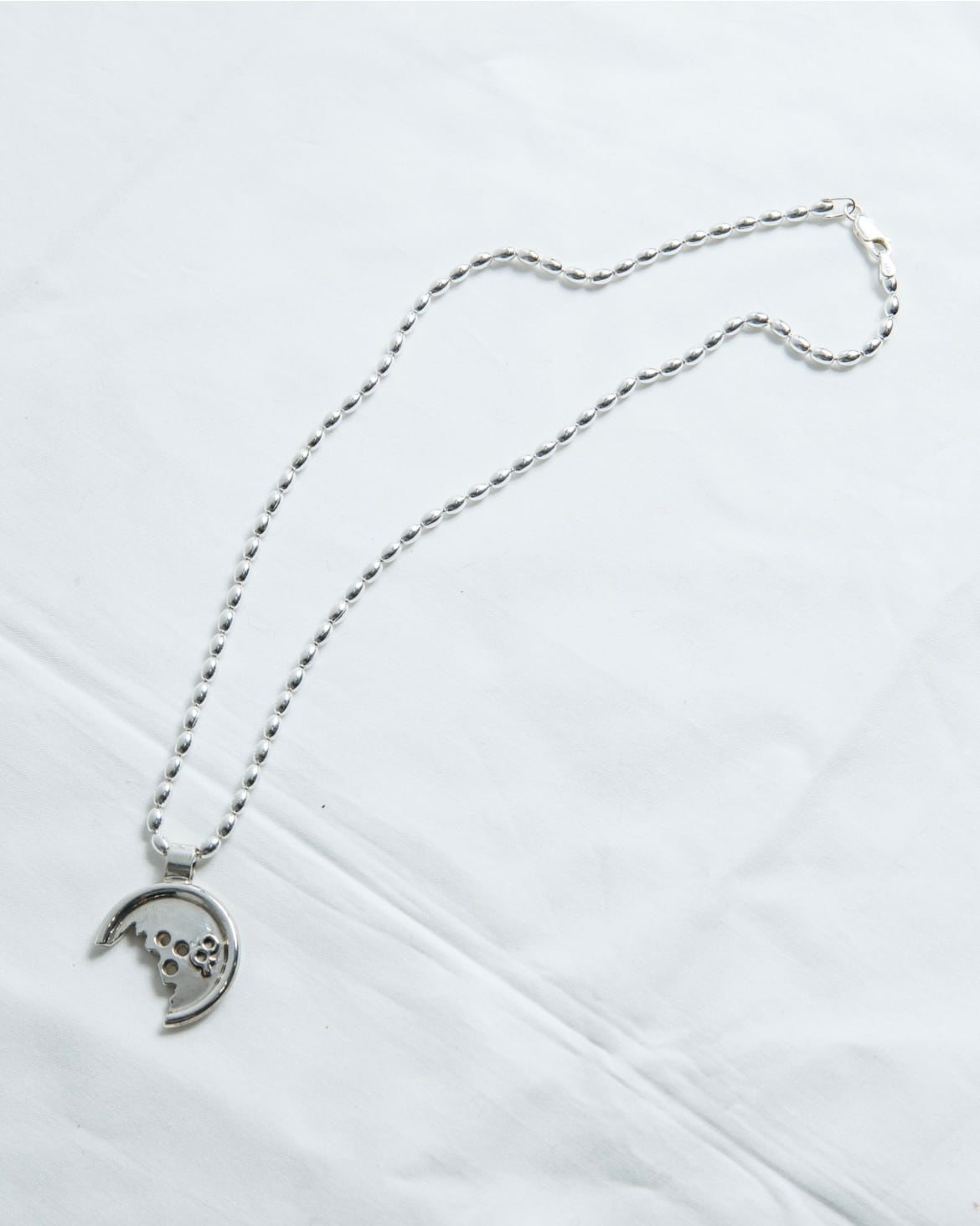 欠けたボタンの断片に、“&” のモチーフを重ねたシルバーネックレス。